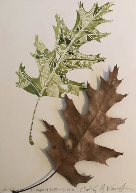 “I spent some time with a dry oak leaf while we were in the shelter, and finished my playful study this morning. I noticed myself practicing the 4-7-8 breathing while I was painting. On my recent trip to Argentina, I made a practice of spending time with leaves by painting individual ones. It was a great way to immerse into the place and the moment. I never try to do a representational rendering, but rather a playful one, letting my brush make patterns that just emerge as I go. I use one color so that I don't have to think about which green looks best, I can just touch into the shapes. Anyway, when I was painting today, I found myself very grateful for the day we had together. Thank you, thank you.” (Cathy Vaughn)